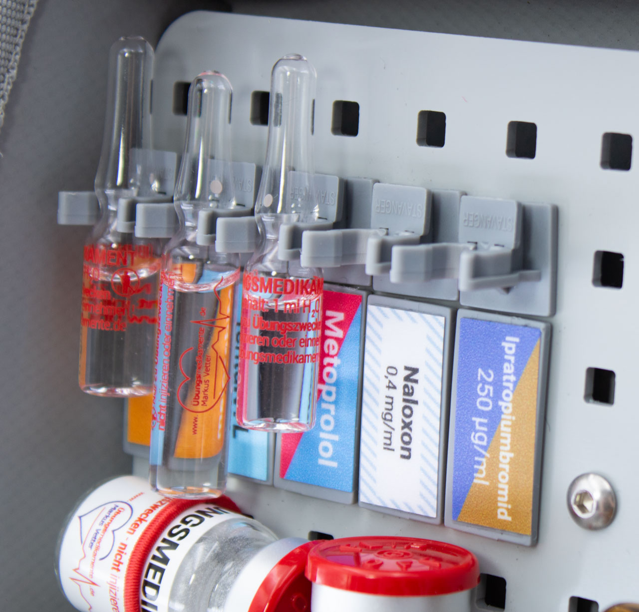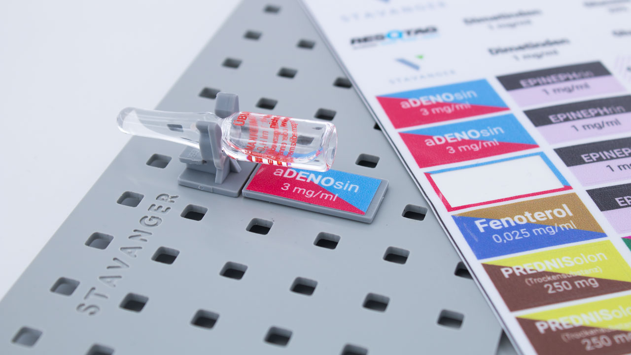 The STAVANGER® MEDITAG sets enable clear and standard-compliant color coding of medications according to active ingredient groups in accordance with DIN EN ISO 26825 and DIVI recommendations. They are specially designed for use in STAVANGER® ampoule holders or on STAVANGER® system plates and support structured and safe organization of the medication cabinet in ambulances. The MEDITAGs are affixed to the STAVANGER® labeling clips, ensuring fast, safe, and targeted identification of the correct medication, especially in time-critical situations. The clear visual assignment significantly reduces the risk of confusion and efficiently supports workflows in emergency medical services.