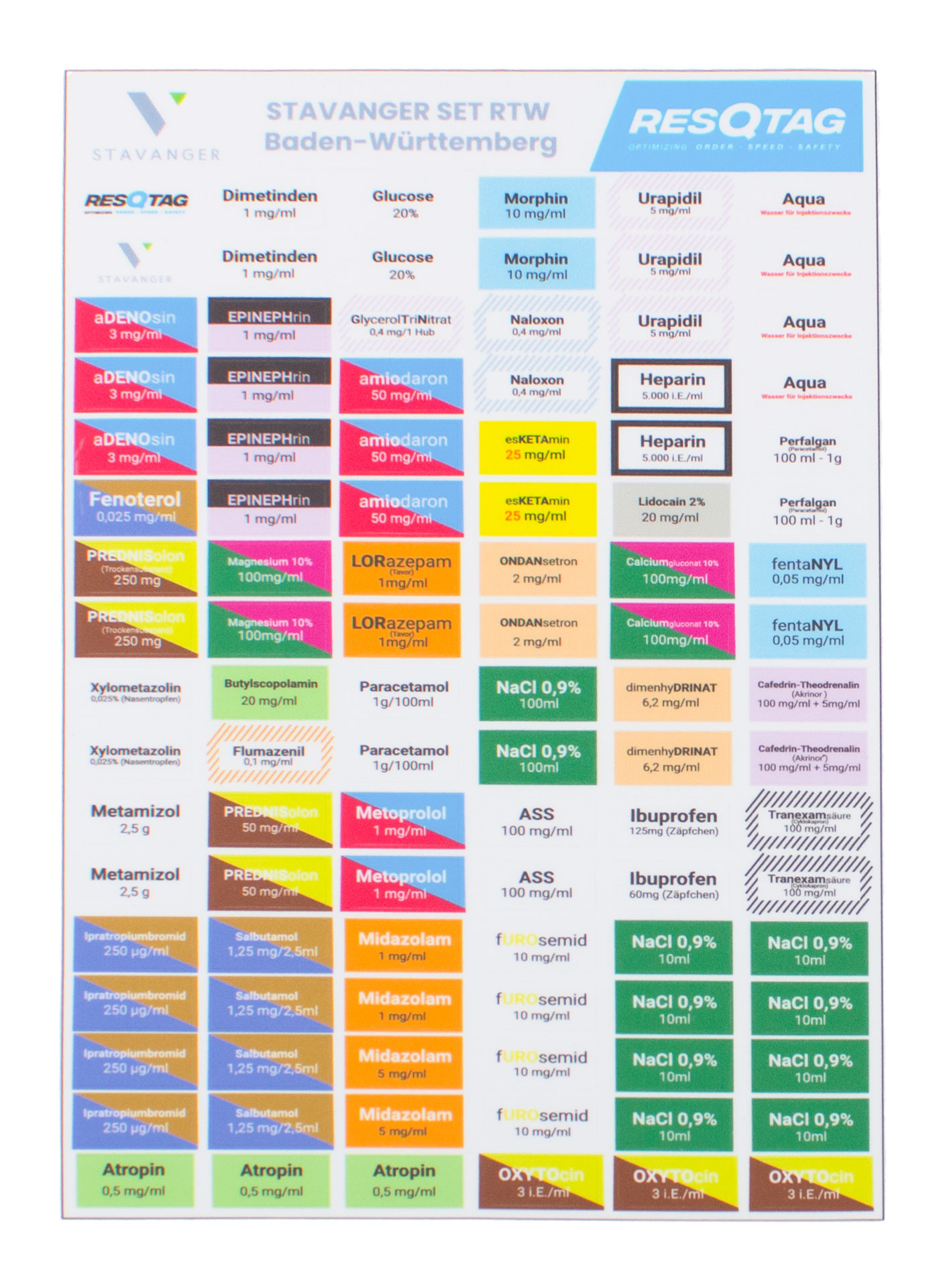 The matte, non-reflective, and non-porous surface ensures optimal visibility, while the robust material guarantees a long service life in daily use. The sets are put together according to the requirements of the state of Baden-Württemberg for the standard minimum equipment of ambulances and emergency medical services. The STAVANGER® MEDITAGs Set RTW Baden-Württemberg comprises 100 stickers in accordance with DIVI, while the STAVANGER® MEDITAGs Set NEF Baden-Württemberg contains 138 stickers in accordance with DIVI. Both sets thus offer a practical and standard-compliant solution for professional medication organization in emergency medical services.