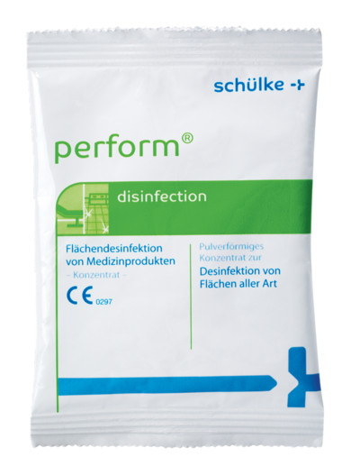 perform® pro Flächendesinfektion, 40 g, Konzentrat ist ein pulverförmiges Flächendesinfektionsmittel und zeichnet sich durch sein breites Wirkspektrum aus. Durch die Basis von aktivem Sauerstoff verursacht das Desinfektionsmittel keine Belastung der Raumluft und ist dabei sehr umweltbewusst. Das Perform kann auf empfindlichen Materialen, wie zum Beispiel Acrylglas, Übungspuppen, Atemschutz- und Inhalationsmasken verwendet werden. Für den Anwender besteht eine leichte Dosierung durch die praktische Verpackung der 40g Beutel.